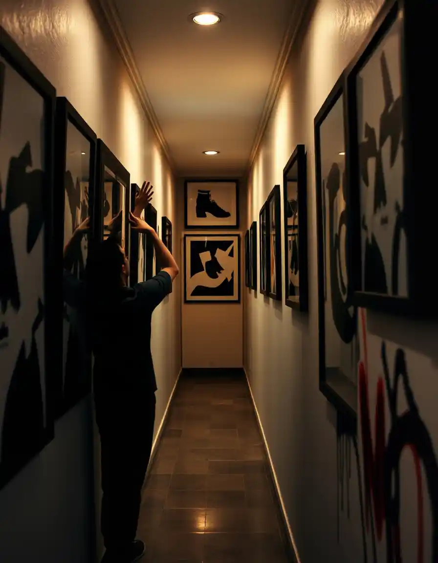 Dans les couloirs, privilégiez une hauteur régulière de 145 à 155 cm pour le centre des cadres afin de respecter le passage visuel naturel. Les cadres doivent rester alignés et proportionnés par rapport à la largeur du couloir pour éviter toute sensation d’écrasement et assurer une circulation fluide.
