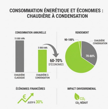 La chaudière à condensation récupère la chaleur contenue dans les fumées de combustion, ce qui améliore son rendement et réduit la consommation de gaz par rapport à une chaudière classique à haute température.