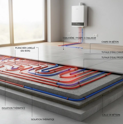 Avant d’envisager l’installation, pensez à l’impact sur le niveau du plancher, qui peut nécessiter d’ajuster les portes ou les plinthes existantes. Ce système est particulièrement adapté aux nouvelles constructions ou aux rénovations planifiées, et peut constituer un investissement rentable sur le long terme grâce à sa double fonction chauffage et rafraîchissement.