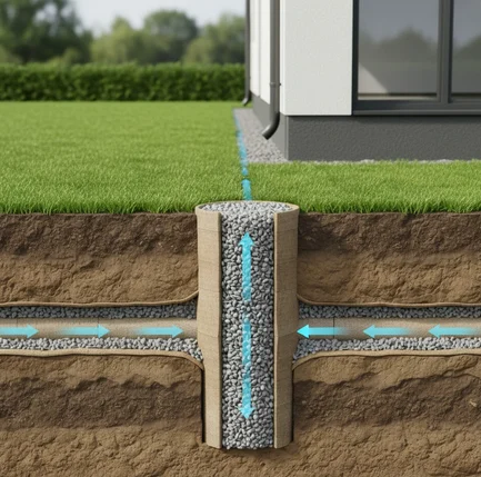 Lorsque le sol infiltre mal ou que les volumes d’eau sont importants, les puits d’infiltration et tranchées drainantes offrent une alternative efficace 💧. Ces ouvrages enterrés stockent temporairement l’eau avant de la diffuser lentement dans le sol. Ils sont particulièrement utiles pour les maisons situées en contrebas ou sur des terrains argileux. Leur mise en œuvre demande une étude préalable et un respect strict des prescriptions locales, mais ils apportent une solution durable pour maîtriser les écoulements sans nuire au voisinage.