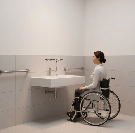 Pour les personnes en fauteuil roulant, la hauteur du lavabo doit garantir une approche frontale facile et un usage autonome. L’espace sous l’évier doit rester dĂ©gagĂ©, et la mesure s’effectue toujours par rapport au sol fini, afin d’éviter toute erreur lors de l’installation. Un lavabo lĂ©gĂšrement plus bas, associĂ© Ă  une robinetterie accessible, amĂ©liore nettement le confort et la sĂ©curitĂ© au quotidien, tout en respectant les principes d’ergonomie.