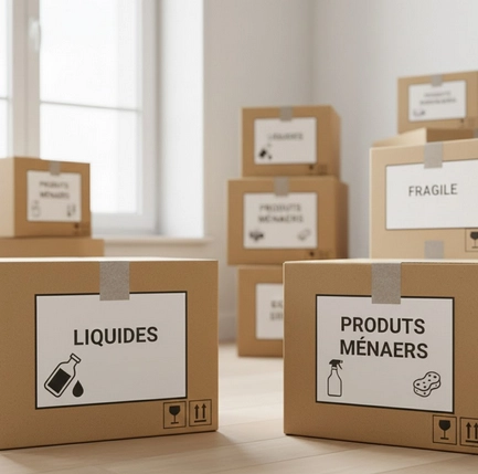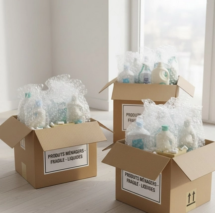 - Étiquetez clairement les cartons contenant des produits ménagers avec la mention “liquides” ou “produits sensibles” pour alerter les manutentionnaires.