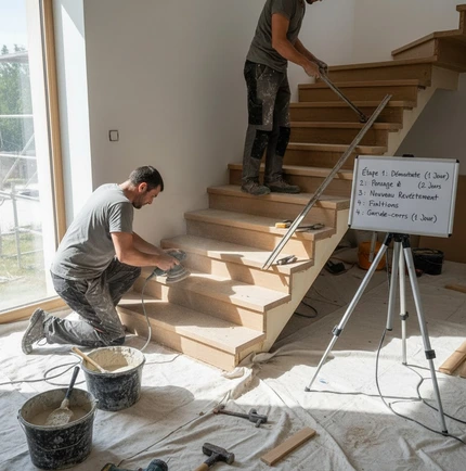 En termes de durĂ©e, une rĂ©novation lĂ©gĂšre peut ĂȘtre rĂ©alisĂ©e en quelques heures Ă une journĂ©e, alors quâune transformation complĂšte, incluant le retrait de lâancien escalier et la pose dâun nouveau revĂȘtement sur-mesure, peut sâĂ©tendre sur plusieurs jours. Il est important de prĂ©voir le temps nĂ©cessaire pour le sĂ©chage ou le traitement des matĂ©riaux afin dâĂ©viter toute dĂ©convenue.