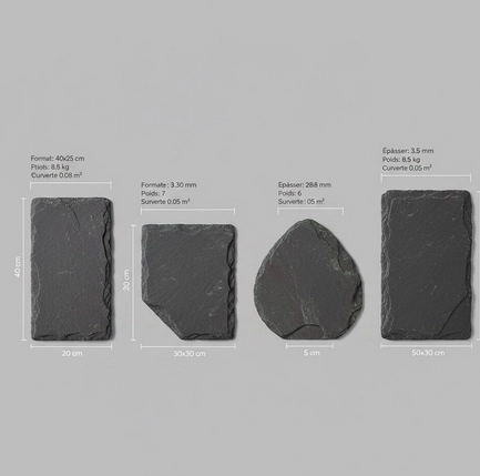 L’ardoise naturelle se distingue par sa composition minérale dense, qui lui confère une excellente résistance dans le temps. Chaque élément est taillé selon des formats précis, choisis en fonction de la pente du toit, de l’exposition aux intempéries et du rendu esthétique recherché. Ces dimensions ne sont jamais laissées au hasard : elles conditionnent directement la performance et la longévité de la couverture.