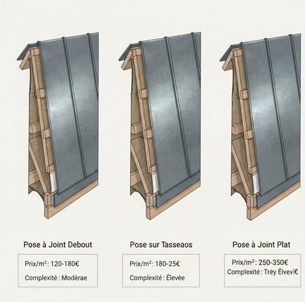 Le prix au mĂštre carrĂ© dâune toiture en zinc varie fortement selon la mĂ©thode de pose retenue. La technique du joint debout, aujourdâhui la plus rĂ©pandue, offre un excellent compromis entre Ă©tanchĂ©itĂ©, durabilitĂ© et maĂźtrise du budget. Elle repose sur des feuilles de zinc assemblĂ©es par des relevĂ©s verticaux, ce qui limite les risques dâinfiltration tout en accĂ©lĂ©rant la mise en Ćuvre. Ă lâinverse, la pose sur tasseaux, plus traditionnelle, demande davantage de temps et de prĂ©cision, ce qui se reflĂšte directement sur le coĂ»t final đ°.